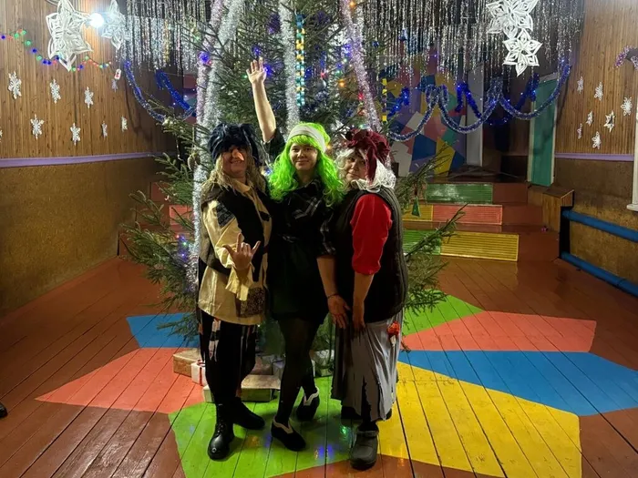 Гостей встретили Старая Баба Яга, Баба Яга и Бабка Ёжка, которым было скучно сидеть в своей избушке и они решили выйти в люди, потому что с людишками-то оно веселее встречать Новый Год.